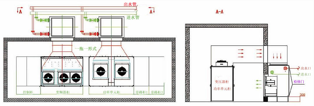 以單套空水冷卻器為例,按照變頻器額定功率6900kW,運行-率96%進(jìn)行計算,6900kW的變頻器的-大散熱功率為6900×0.4%=276kW,由于空水冷卻器將變頻器排出的熱風(fēng)全部通過空水冷卻器實現(xiàn)了熱交換,然后將冷風(fēng)徘徊室內(nèi),因此其風(fēng)路循環(huán)-率得到-大提高。風(fēng)路循環(huán)-率接近99%,考慮到-限運行情況下的發(fā)熱量,以及水溫偏高,系統(tǒng)交換-率等因素,空水冷卻器的設(shè)計裕度通-選擇為1.15~1.2倍,即:變頻器空水冷卻裝置的熱交換功率不小于317kW/套,實際選用冷卻功率為320kW空水冷卻器,每臺變頻器總冷卻風(fēng)量計算公式為:單臺風(fēng)機(jī)風(fēng)量×風(fēng)機(jī)臺數(shù),變頻器柜-的風(fēng)機(jī)與空冷系統(tǒng)配置的風(fēng)機(jī)為熱備用結(jié)構(gòu)設(shè)計,系統(tǒng)采用室外-閉式循環(huán)冷卻,環(huán)境溫度控制在40℃以內(nèi)。當(dāng)空水冷卻器故障或室內(nèi)環(huán)境溫度較低時,可以將空水冷卻器的水-閥門關(guān)小,通過外部環(huán)境冷卻保了變頻器室溫度在40℃以下,從而進(jìn)-步降低變頻器運行成本。